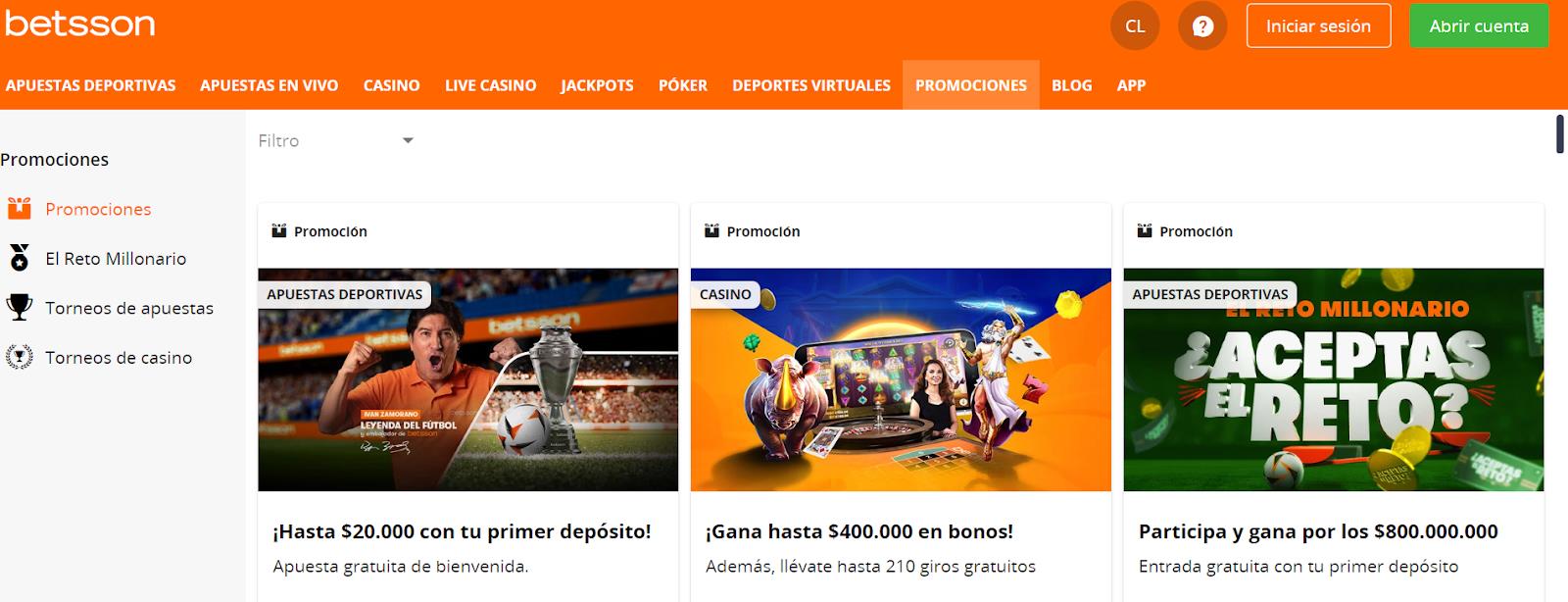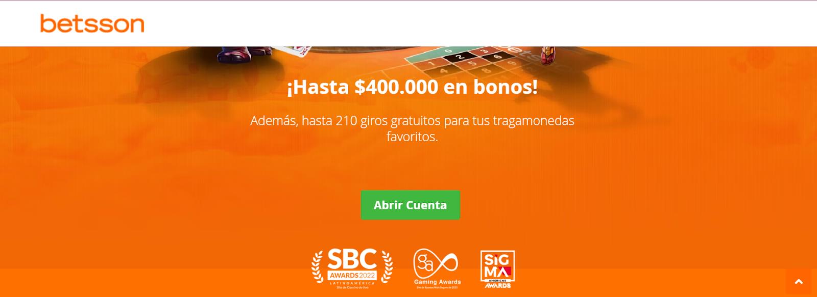 El atractivo Bono Betsson ofrece para nuevos jugadores un bono de bienvenida de hasta $400.000 CLP. Para optar a esta promoción debes unirte a la bonificación mediante una notificación que recibirás en el apartado de mensajes de tu cuenta y después tienes que hacer tu primer depósito. Debes depositar mínimo $10.000 CLP, el valor máximo de la bonificación de bienvenida en casino es de $200.000 CLP y en casino en vivo es de $200.000 CLP. Esta bonificación tiene un periodo de validez de 15 días, luego de creada su cuenta. Esta casa de apuestas también cuenta con un bono de bienvenida para apuestas deportivas, se trata de una bonificación de hasta $20.000 CLP y 210 giros gratis. Para activar esta promoción debes hacer un depósito desde $10.000 CLP y podrás recibir una apuesta gratuita de hasta $20.000 CLP para tus deportes preferidos y hasta 210 giros gratis.
