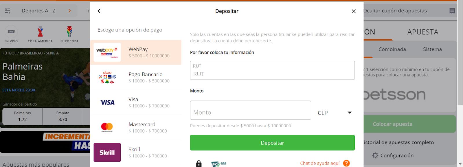 Puedes transferir fondos directamente desde tu cuenta bancaria a la cuenta de Betsson. Desde bancos como: BancoEstado, BBVA, Banco Internacional y Scotiabank.