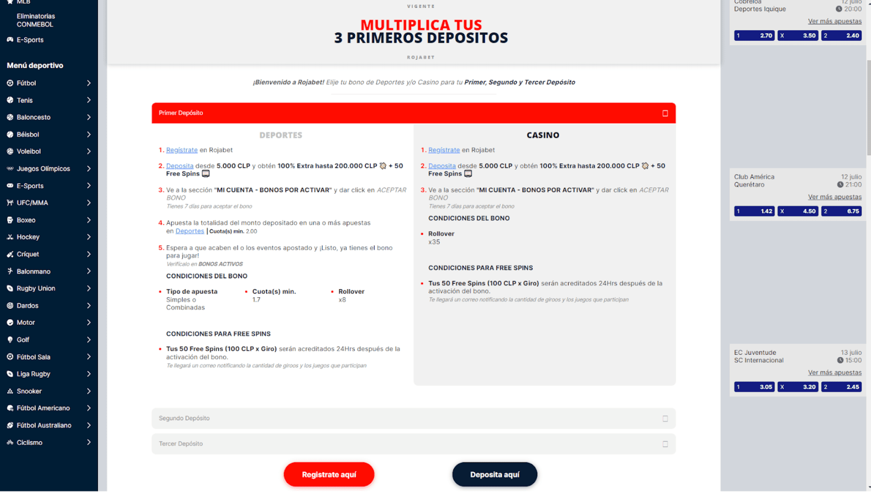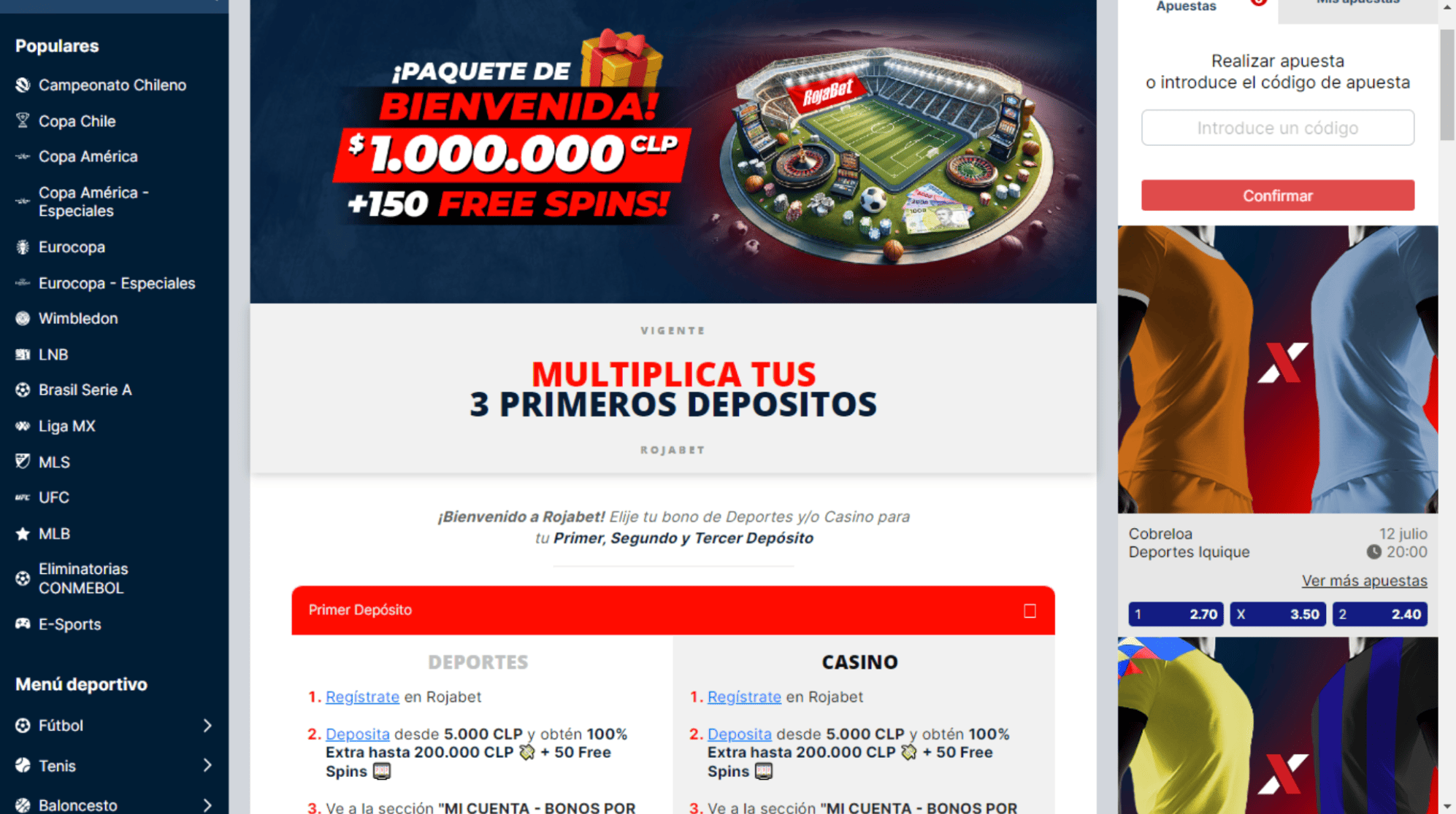 | Oferta de bonos deportivos | Bono de bienvenida del 100% hasta 1.000.000 CLP |